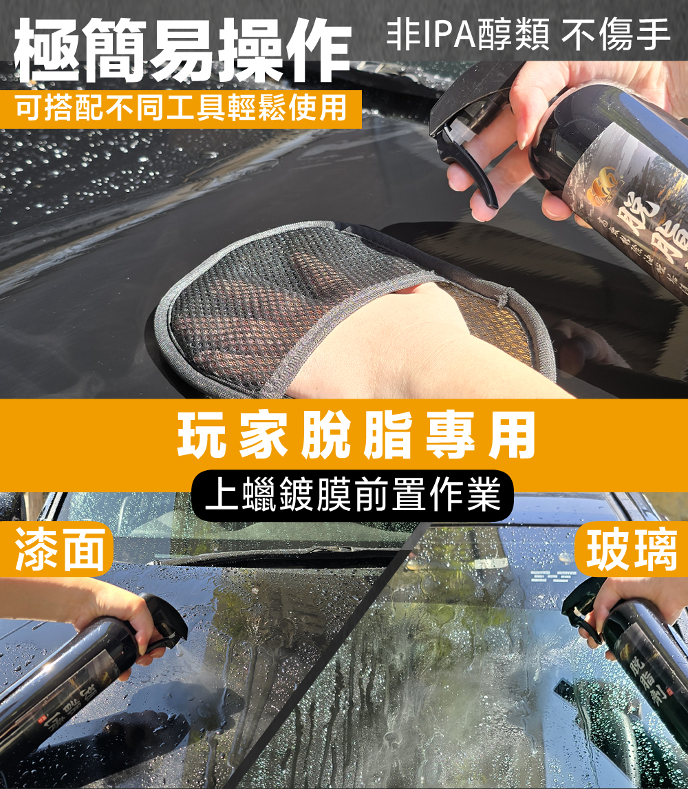 2.將脫脂劑噴灑於漆面上,可搭配仿羊毛手套輕抹,加快作業速度