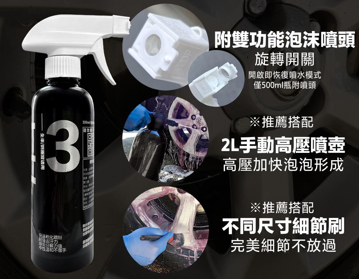 以泡沫形式增加瞬間附著力,更為完善效能的同時,大幅加快產生紫色還原反應,從而保護漆面/鋁圈