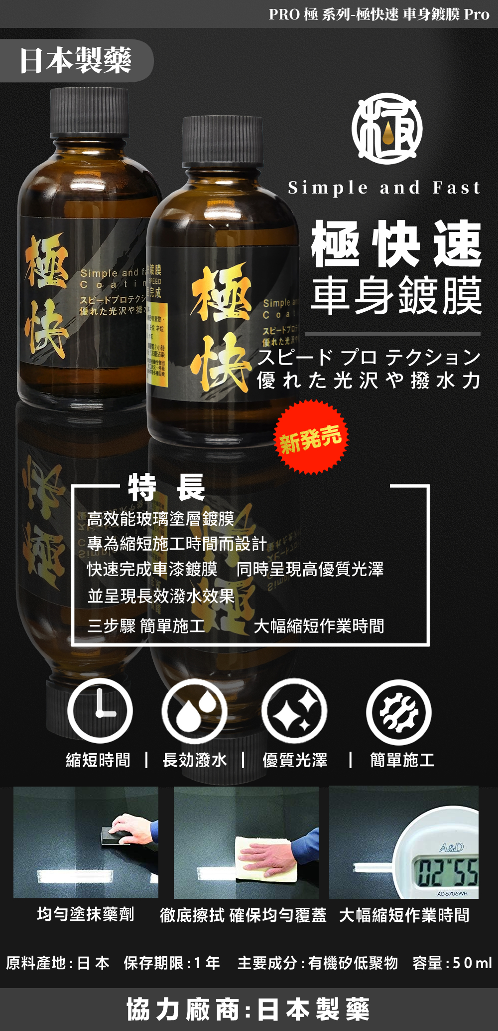 快速完成車漆鍍膜,同時呈現高優質光澤與長效潑水效果。