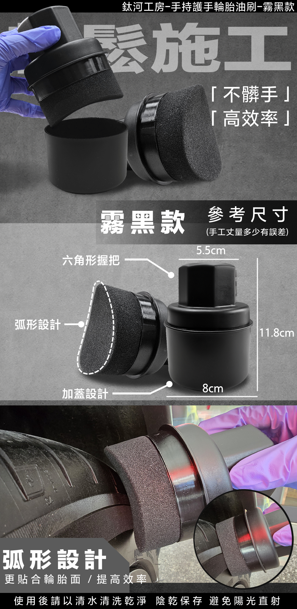 改良後的六角手把與高密度海綿,能讓輪胎油均勻塗抹,不再擔心弄髒雙手或鋁圈。