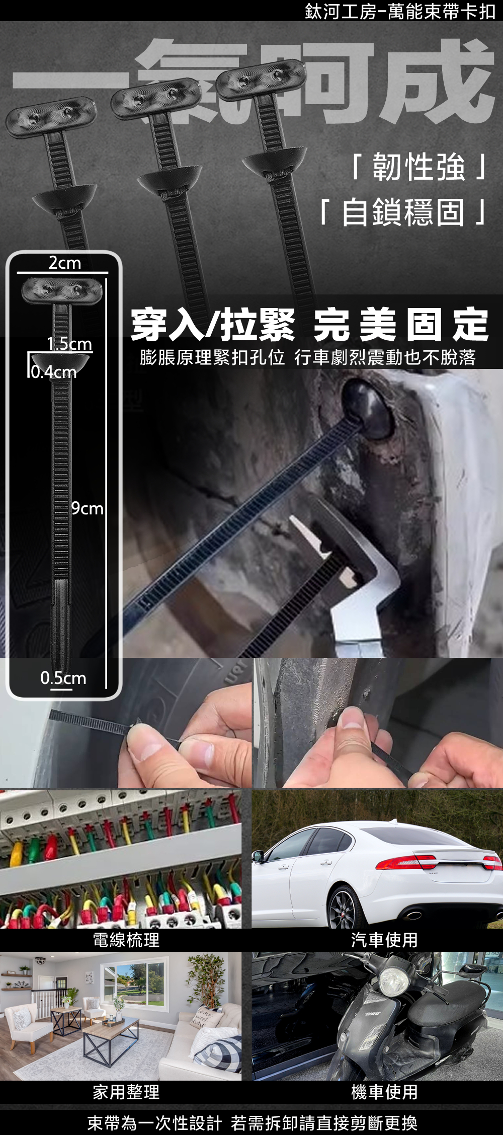 結合束帶與膨脹釘功能,穿入、拉緊、固定,一氣呵成。